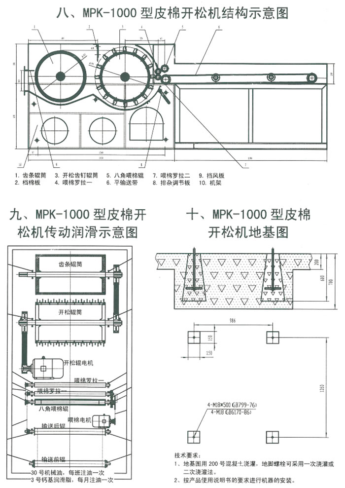 1、轴承6310 2、带座轴承L390505 3、带座轴承L390504 4、轴承61905 5、尼龙平胶带:3100×880×5 6、钩棉板(MPK--1000.01.01-1) 7、开松专用齿条(8.8×3T×2.0) 8、尼龙衬套(MPK--1000.05-15) 9、小齿轮(Z=29)(MPK--1000-02)