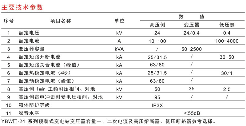 YBW□-24/0.4箱式变电站产品概述 YBW□-24/0.4箱式变电站分为高压室、变压器室、低压室三大部分。 箱式变电站将高压开关设备、变压器、低压开关设备和其他附属电器元件组合成能使用户外运行环境;能独立完成电压变换和电能保护、控制、分配等功能。产品多样化设计、组合灵活方便,适合配电网络节点和终端使用,具有结构紧凑、安全可靠、占地少、造价低等优点。 |