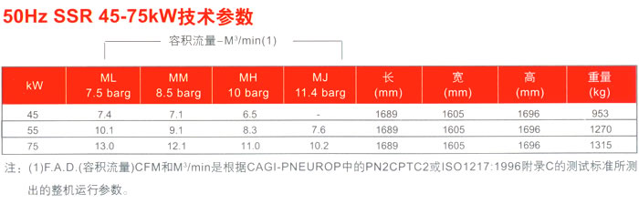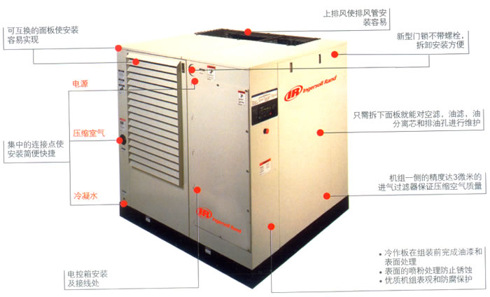 整体组装设计-坚固,超静音,便于维护保养 ◆ 较高环境温度下运行- 你是否能够承担空压机因酷暑停车而造成的后果呢?SSR系列产品能够在高温环境中(115℉/46℃)有效运行。即使是在酷热的天气中,也能避免由于夏天的高温和弄脏的冷却器而产生令人讨厌的停车现象。 ◆ 维修保养方便- 外罩面板拆卸方便,易于日常维护保养,这些面板同时确保了机组低噪音运行。 ◆ 简便的安装- 把机器就位,接上供应电源及管道系统,盖住机器底部的铲车孔即可。不需要另外安装减震垫。 ◆ 低噪音运行- 我们选择的静音面板可以确保压缩机在任何操作条件下都能安静地运转。 ◆ 整机测试- 任何一台出厂的SSR产品都要经过整机性能及运行测试,以保证机器的高品质。